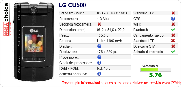 Dati del telefono cellulare LG CU500 sul tuo sito