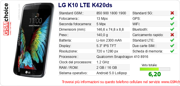 Dati del telefono cellulare LG K10 LTE K420ds sul tuo sito