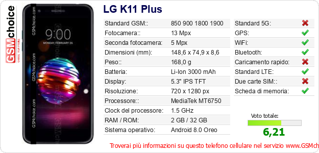 Dati del telefono cellulare LG K11 Plus sul tuo sito