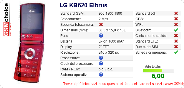 Dati del telefono cellulare LG KB620 Elbrus sul tuo sito