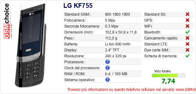 Dati del telefono cellulare LG KF755 sul tuo sito