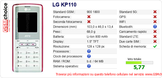Dati del telefono cellulare LG KP110 sul tuo sito