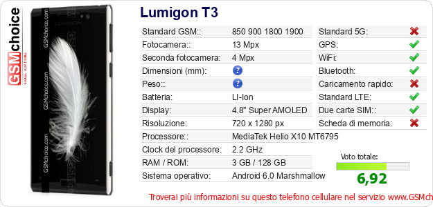 Dati del telefono cellulare Lumigon T3 sul tuo sito