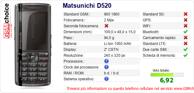Dati del telefono cellulare Matsunichi D520 sul tuo sito