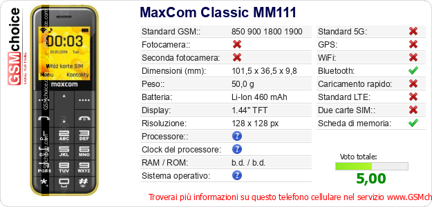 Dati del telefono cellulare MaxCom Classic MM111 sul tuo sito