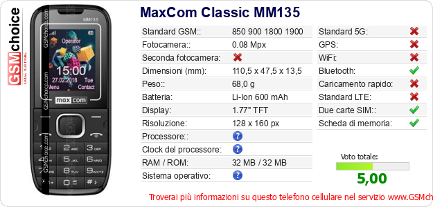 Dati del telefono cellulare MaxCom Classic MM135 sul tuo sito