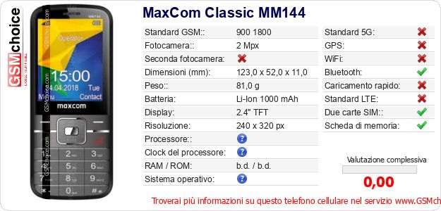 Dati del telefono cellulare MaxCom Classic MM144 sul tuo sito