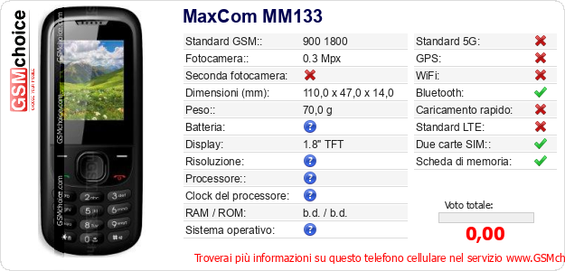 Dati del telefono cellulare MaxCom MM133 sul tuo sito