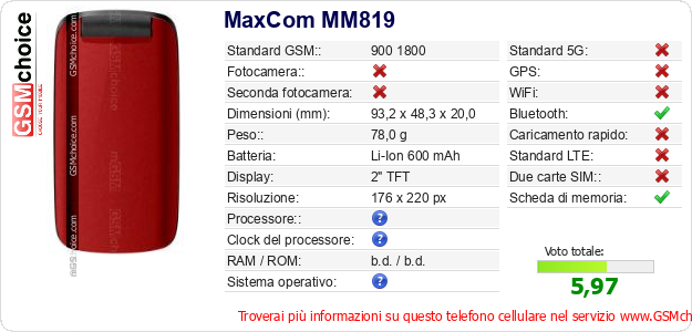 Dati del telefono cellulare MaxCom MM819 sul tuo sito
