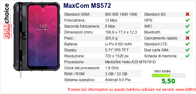 Dati del telefono cellulare MaxCom MS572 sul tuo sito