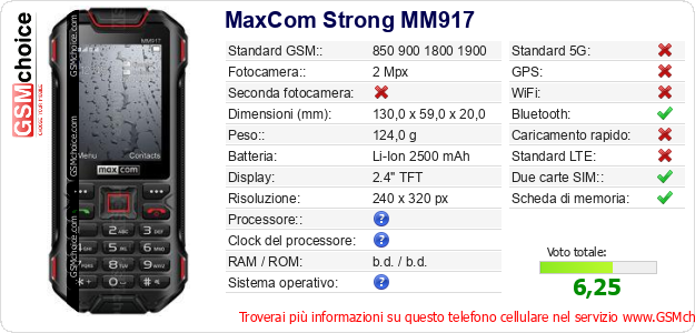 Dati del telefono cellulare MaxCom Strong MM917 sul tuo sito