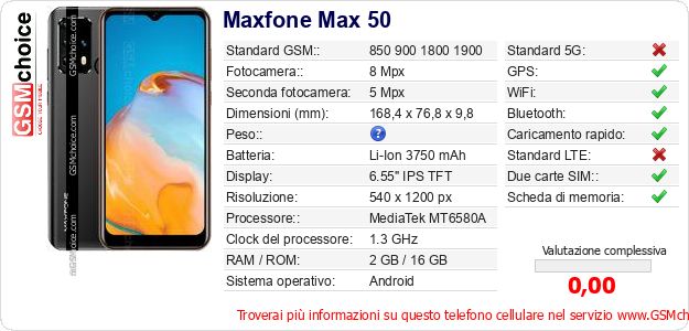 Dati del telefono cellulare Maxfone Max 50 sul tuo sito
