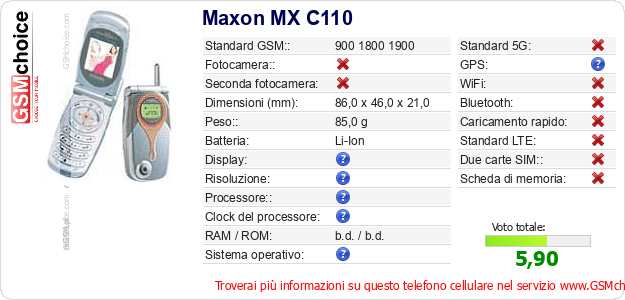 Dati del telefono cellulare Maxon MX C110 sul tuo sito