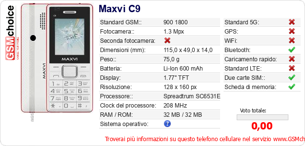 Dati del telefono cellulare Maxvi C9 sul tuo sito