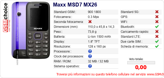 Dati del telefono cellulare Maxx MSD7 MX26 sul tuo sito