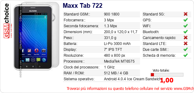 Dati del telefono cellulare Maxx Tab 722 sul tuo sito