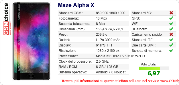 Dati del telefono cellulare Maze Alpha X sul tuo sito