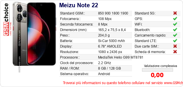 Dati del telefono cellulare Meizu Note 22 sul tuo sito