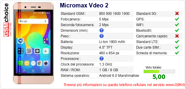 Dati del telefono cellulare Micromax Vdeo 2 sul tuo sito