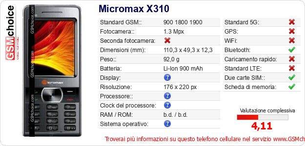 Dati del telefono cellulare Micromax X310 sul tuo sito