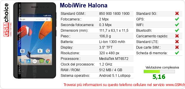 Dati del telefono cellulare MobiWire Halona sul tuo sito