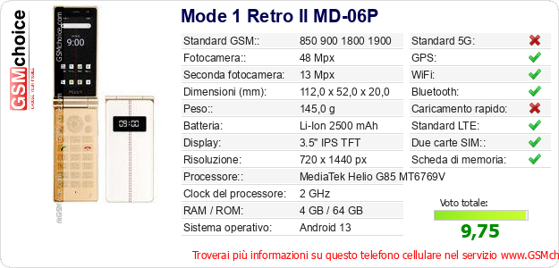 Dati del telefono cellulare Mode 1 Retro II MD-06P sul tuo sito