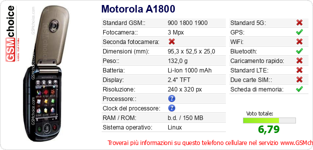 Dati del telefono cellulare Motorola A1800 sul tuo sito