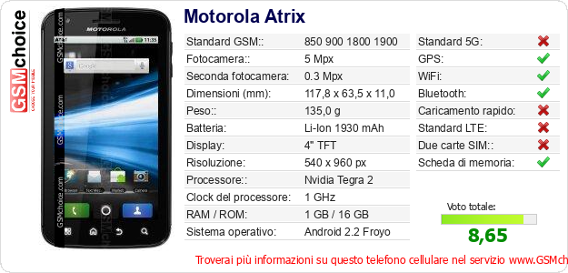 Dati del telefono cellulare Motorola Atrix sul tuo sito