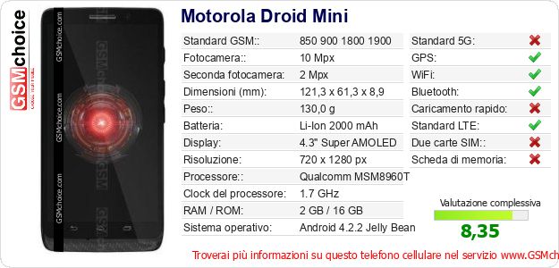 Dati del telefono cellulare Motorola Droid Mini sul tuo sito