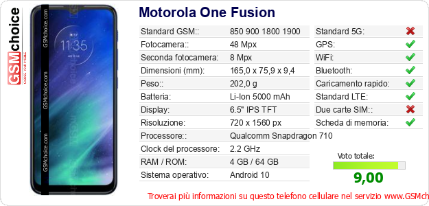 Dati del telefono cellulare Motorola One Fusion sul tuo sito