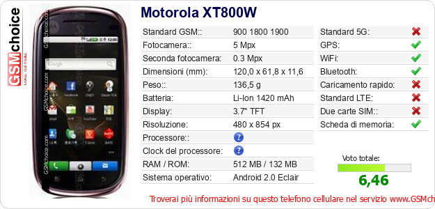 Dati del telefono cellulare Motorola XT800W sul tuo sito