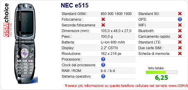 Dati del telefono cellulare NEC e515 sul tuo sito