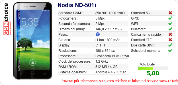 Dati del telefono cellulare Nodis ND-501i sul tuo sito