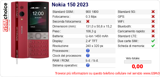 Dati del telefono cellulare Nokia 150 2023 sul tuo sito