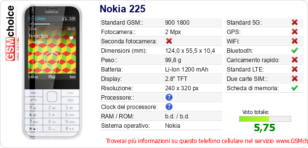 Dati del telefono cellulare Nokia 225 sul tuo sito