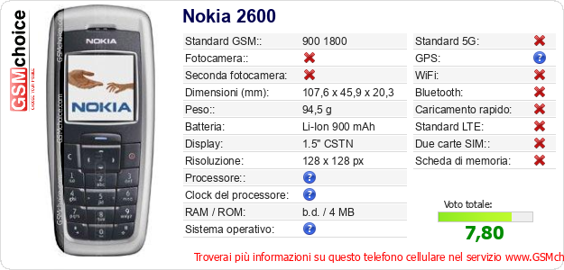 Dati del telefono cellulare Nokia 2600 sul tuo sito