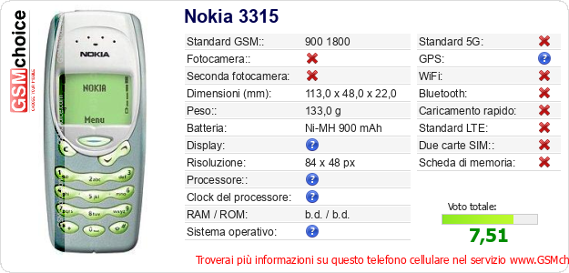 Dati del telefono cellulare Nokia 3315 sul tuo sito