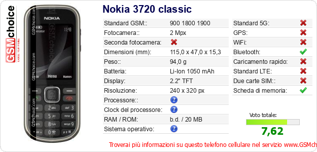 Dati del telefono cellulare Nokia 3720 classic sul tuo sito