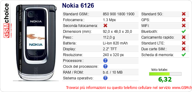 Dati del telefono cellulare Nokia 6126 sul tuo sito