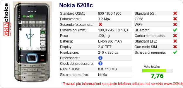 Dati del telefono cellulare Nokia 6208c sul tuo sito