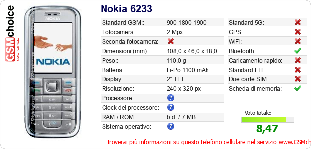 Dati del telefono cellulare Nokia 6233 sul tuo sito