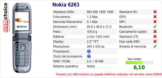 Dati del telefono cellulare Nokia 6263 sul tuo sito