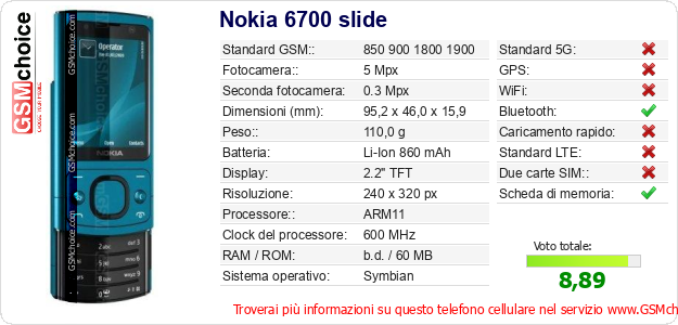 Dati del telefono cellulare Nokia 6700 slide sul tuo sito