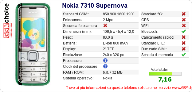 Dati del telefono cellulare Nokia 7310 Supernova sul tuo sito