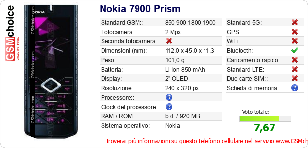 Dati del telefono cellulare Nokia 7900 Prism sul tuo sito