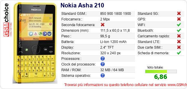Dati del telefono cellulare Nokia Asha 210 sul tuo sito