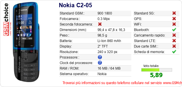 Dati del telefono cellulare Nokia C2-05 sul tuo sito