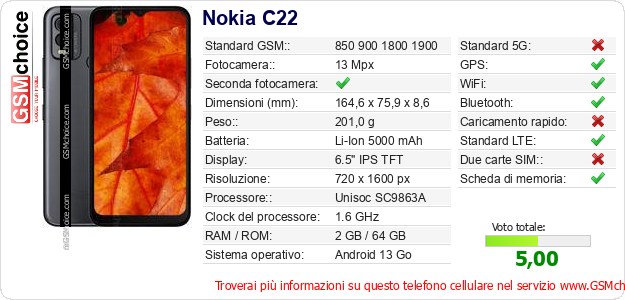 Dati del telefono cellulare Nokia C22 sul tuo sito