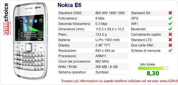 Dati del telefono cellulare Nokia E6 sul tuo sito