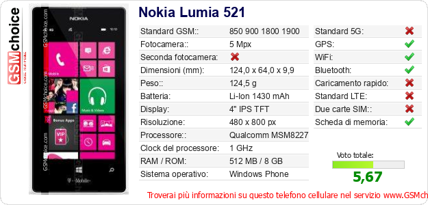 Dati del telefono cellulare Nokia Lumia 521 sul tuo sito